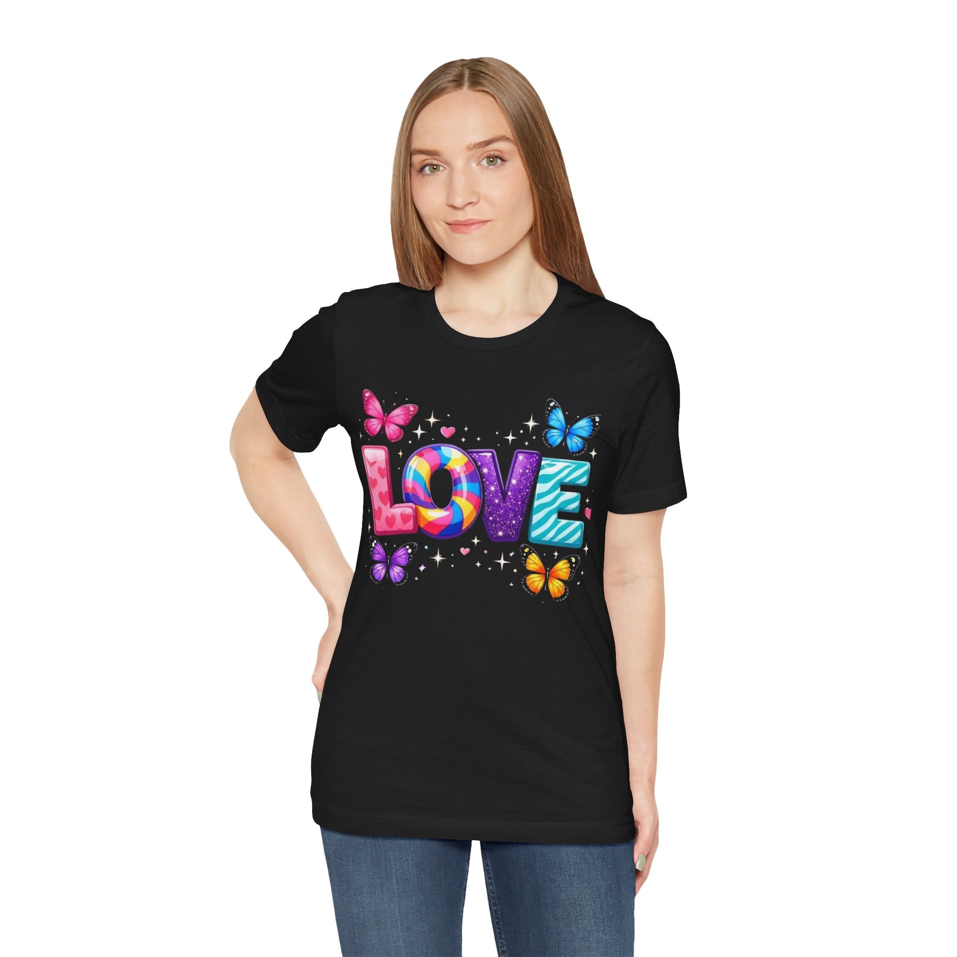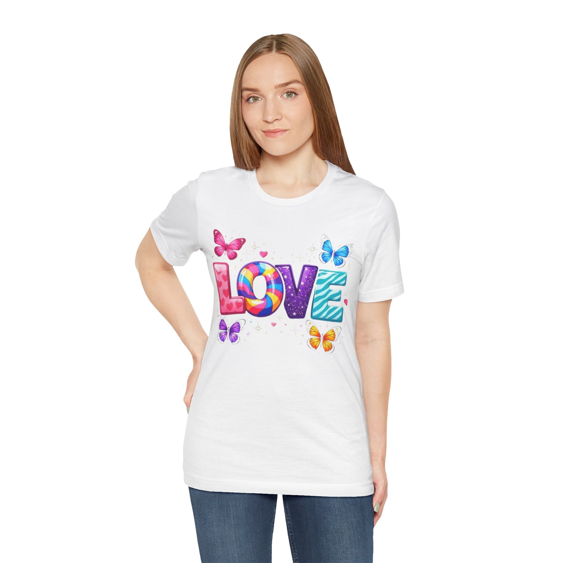 This tee features a colorful, hand-drawn style “LOVE” graphic surrounded by fluttering butterflies and tiny hearts, rendered in vivid hues that pop against the soft white fabric. Cut in a retail crew-neck silhouette with side seams and a ribbed knit collar, it keeps its shape through everyday wear.